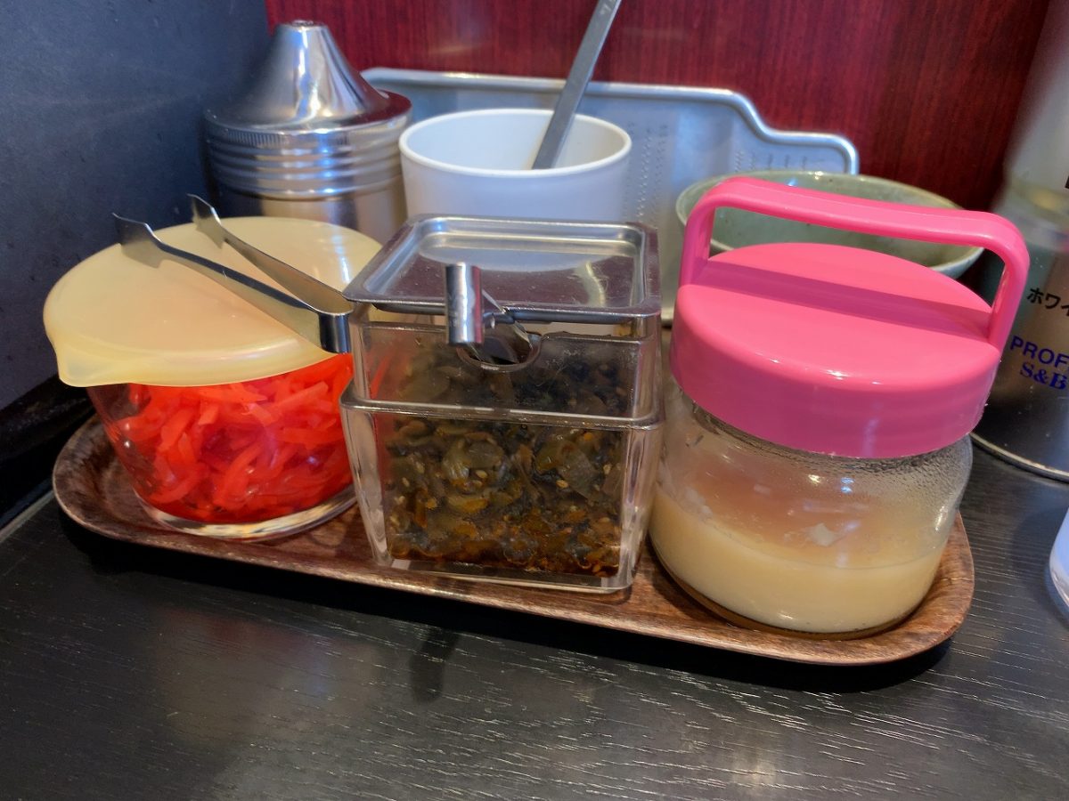 卓上調味料は紅生姜・辛子高菜・にんにく・白胡麻など。細麺なので提供は早めです。