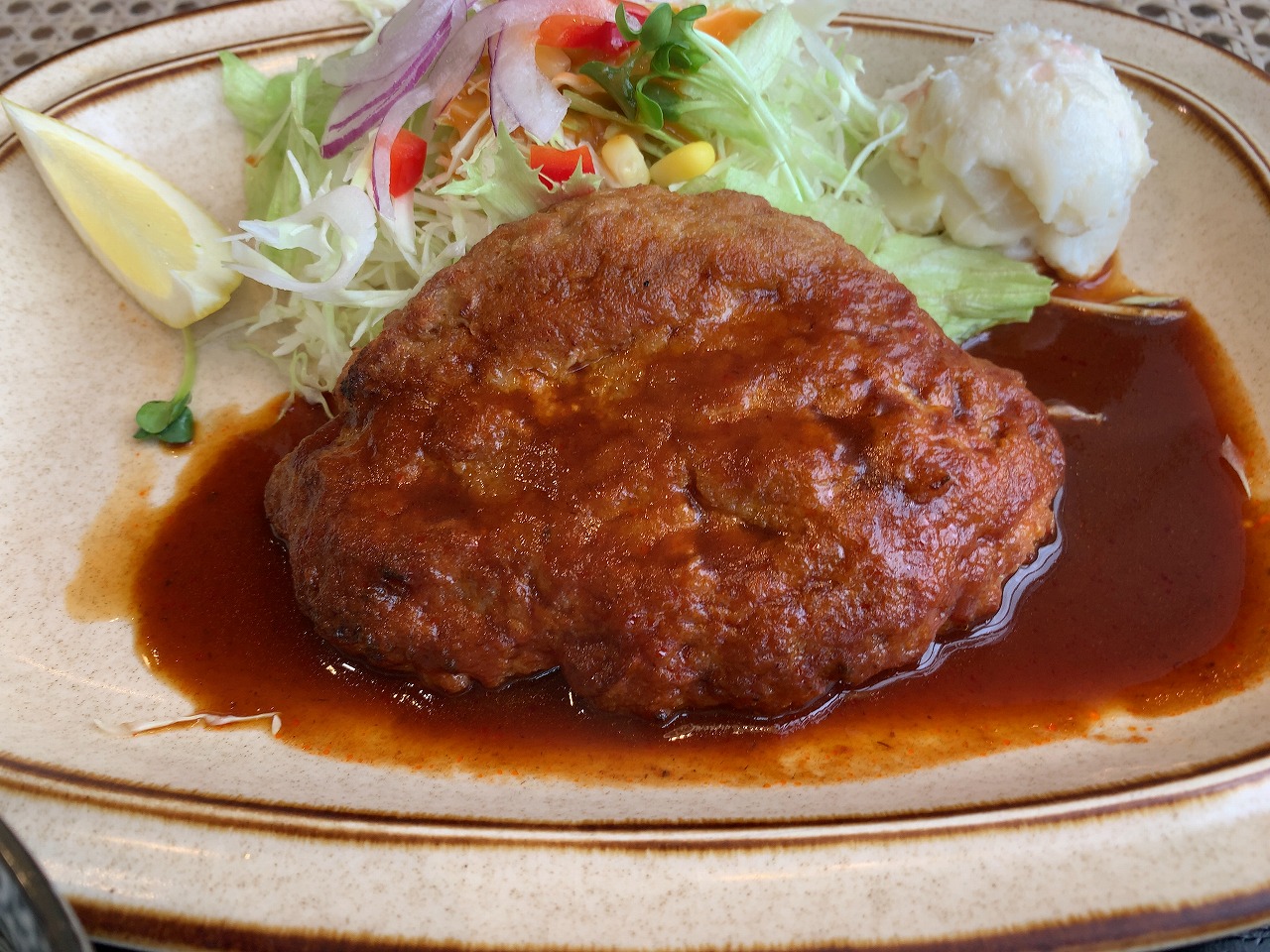ハンバーグは肉肉しい、と言うよりもお客さんの年齢層が高いせいか?挽肉がとてもきめ細かく滑らかで、フワッとした舌触りのハンバーグ。