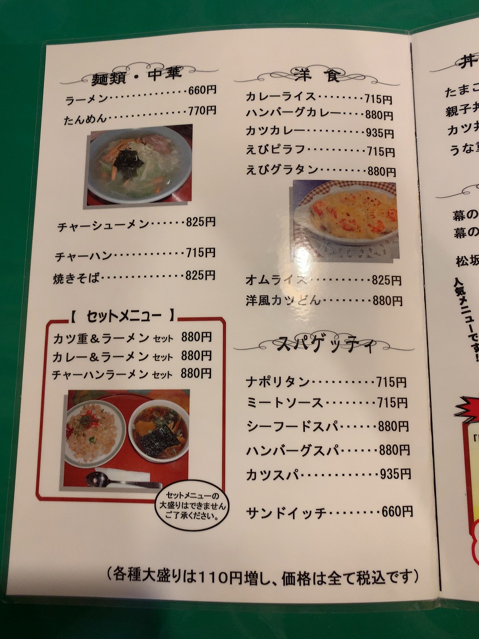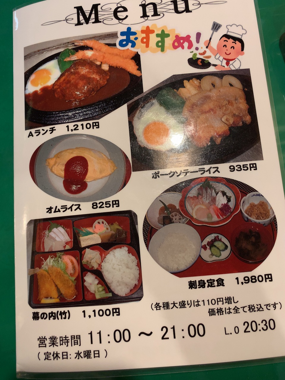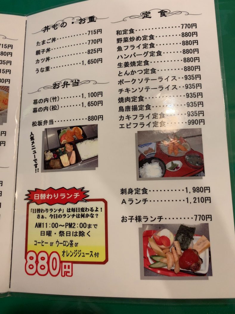 前回来た時もそうでしたが、店内はお年寄りのお客様で大盛況です。ポークソテーライスのつもりでしたが、来る度に同じものなのも芸が無いのでたまには違うものも、とメニューとにらめっこ。