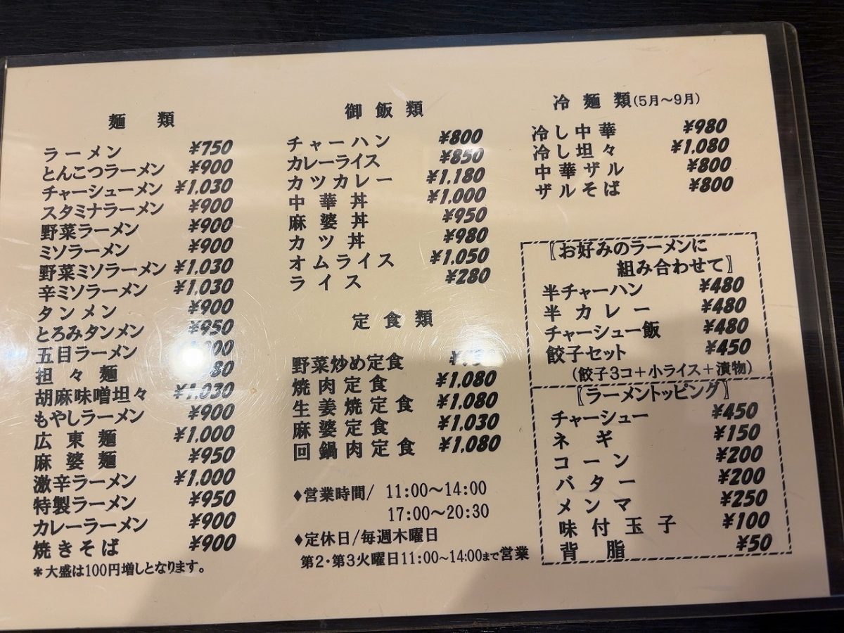 まあ、平日の場合はお昼に仕事用のデカい車で行くので、トラックが停められない様なお店は行けない、ってのも有ります。まずはメニュー拝見。とはいえ最初から決まっていたので「麻婆麺」を注文。